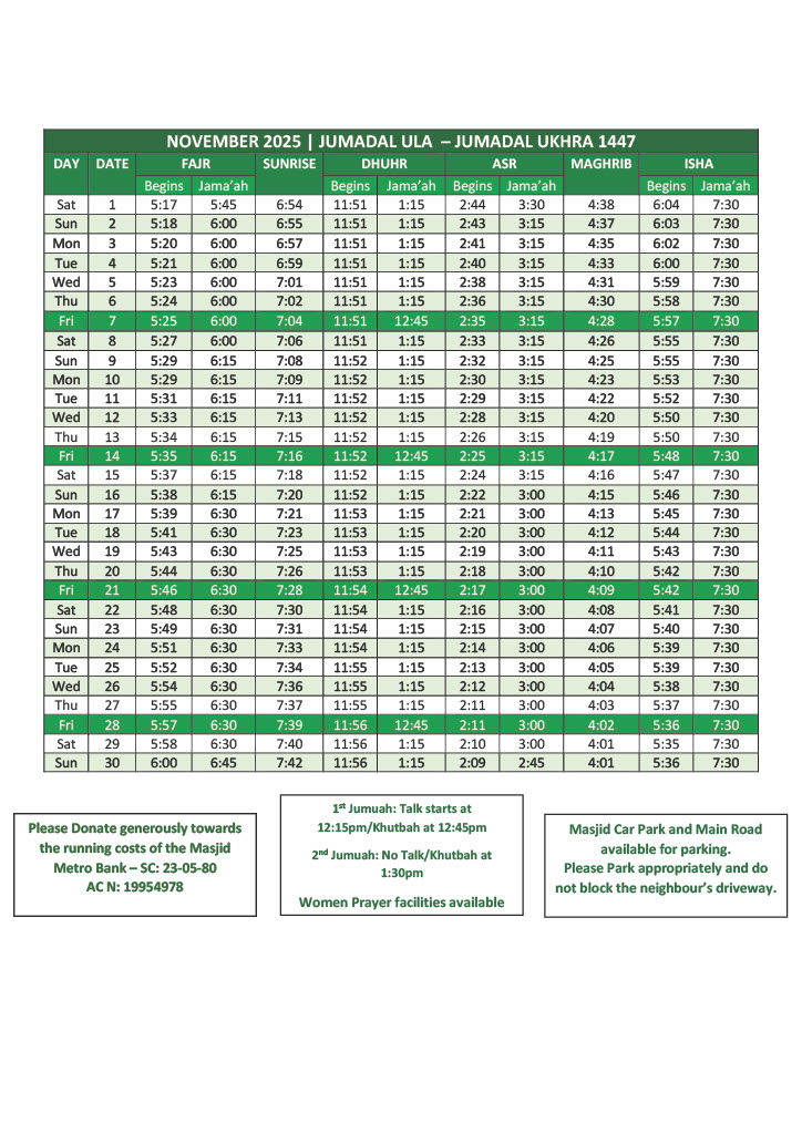 Download this months prayer time table